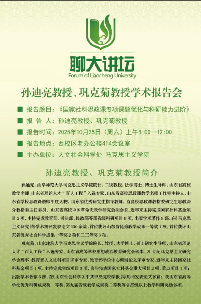 聊大讲坛——孙迪亮、巩克菊教授学术报告会