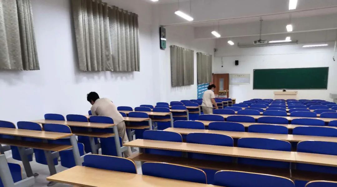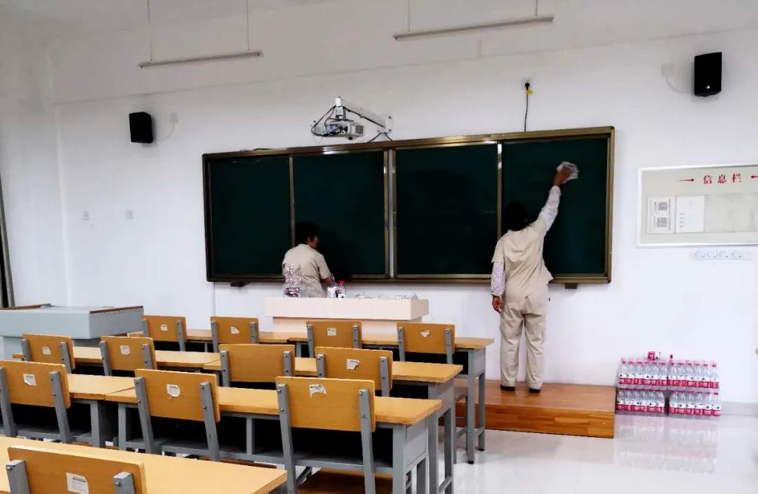 工作人员清洁教室,擦拭黑板、桌椅