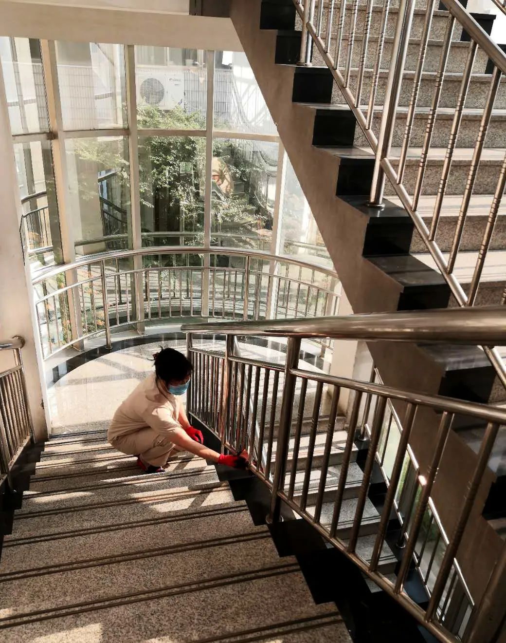 在走廊内喷洒消毒