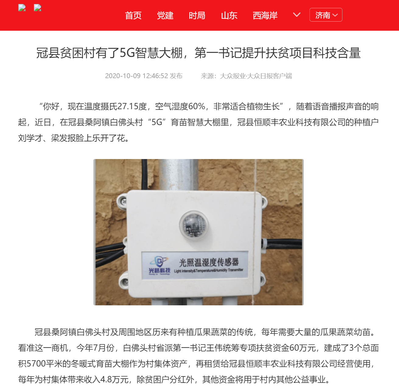 【编者按】10月9日,大众报业·大众日报客户端发布消息《冠县贫困村有了5G智慧大棚,第一书记提升扶贫项目科技含量》,报道了我校派驻冠县桑阿镇白佛头村省派第一书记王伟协调争取科研援助,建成2个 “5G”智慧育苗棚,提升扶贫项目科技含量的先进做法。