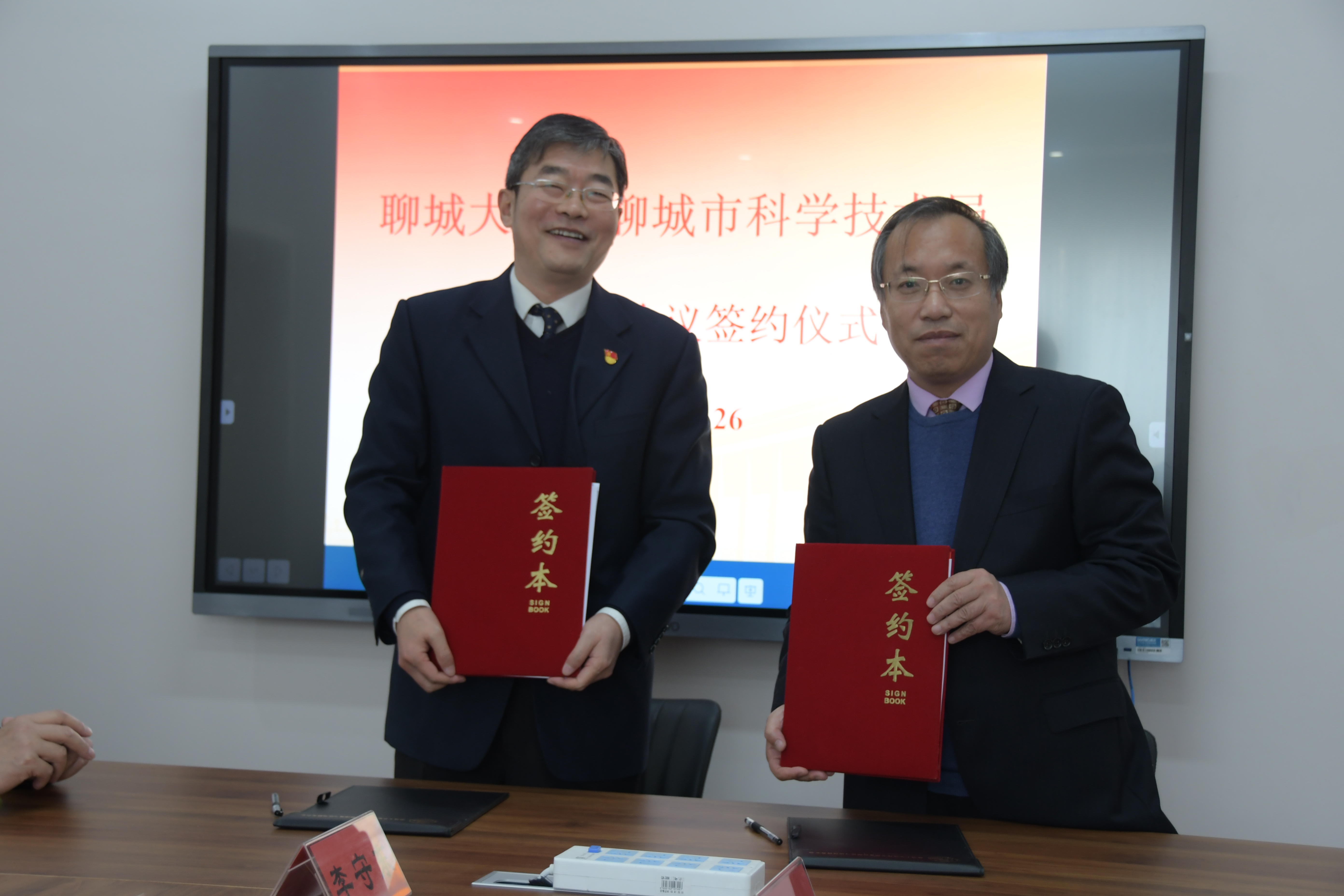 12月26日,聊城大学--聊城市科学技术局科技合作协议签约仪式在我校举行。校党委常委、副校长胡海泉,聊城市科技局局长王越军,科技局副局长范纯志、李旭、袁余成及相关科室负责人和学校相关部门负责人参加活动。校服务社会处处长任忠民主持会议。