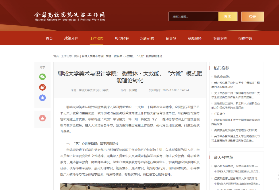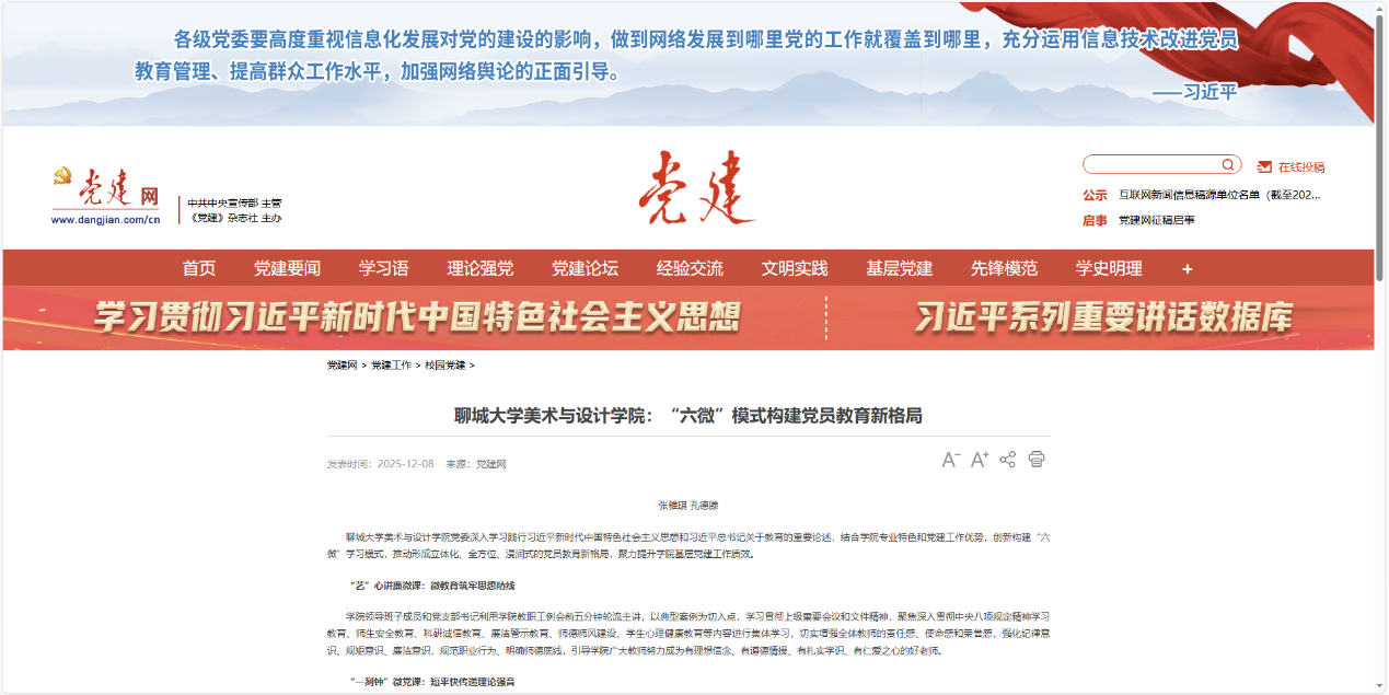 12月8日,党建网以《聊城大学美术与设计学院:“六微”模式构建党员教育新格局》为题报道了我校美术与设计学院党建工作创新举措。美术与设计学院坚持以习近平新时代中国特色社会主义思想为指导,深入贯彻党的教育方针,结合学院专业特色和党建工作优势,系统构建“六微”学习模式,推动思想政治工作贯穿全院教育教学全链条、融入人才培养各环节,形成立体化、全方位、浸润式的党员教育新格局,聚力提升学院基层党建工作质效。