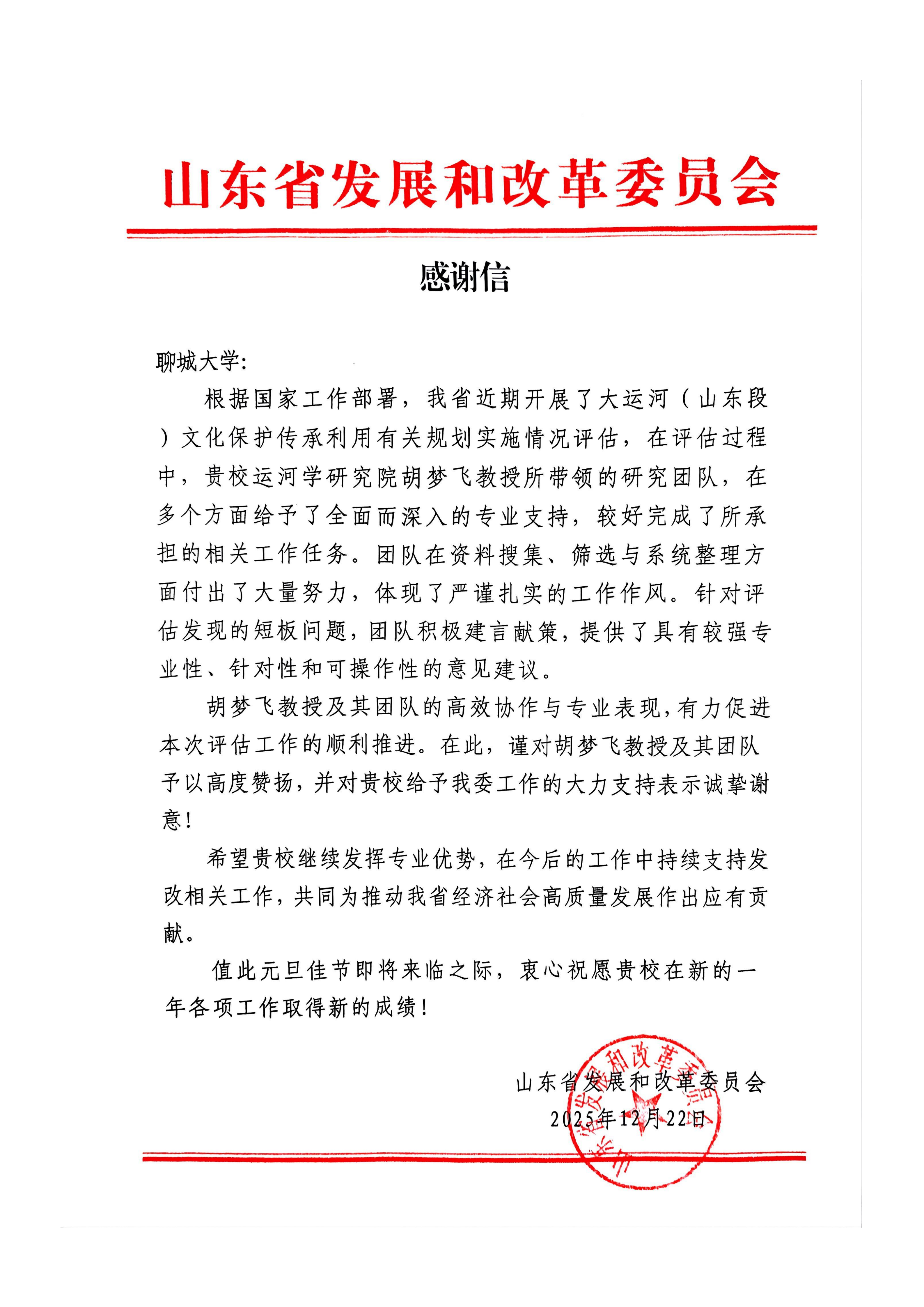山东省发展和改革委员会向聊城大学发来感谢信2025-12-22