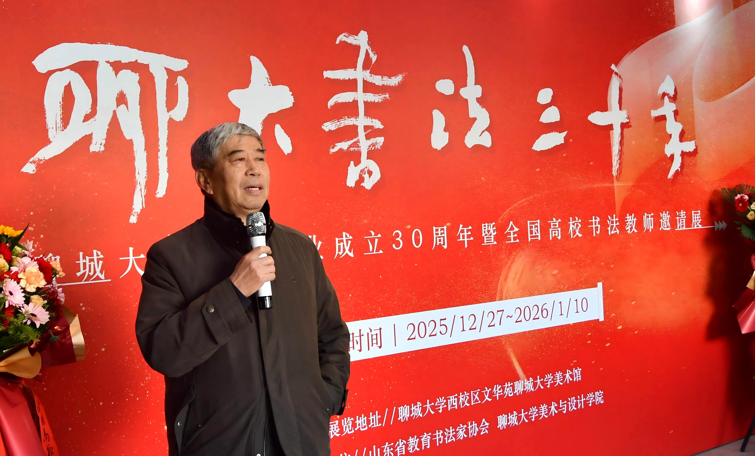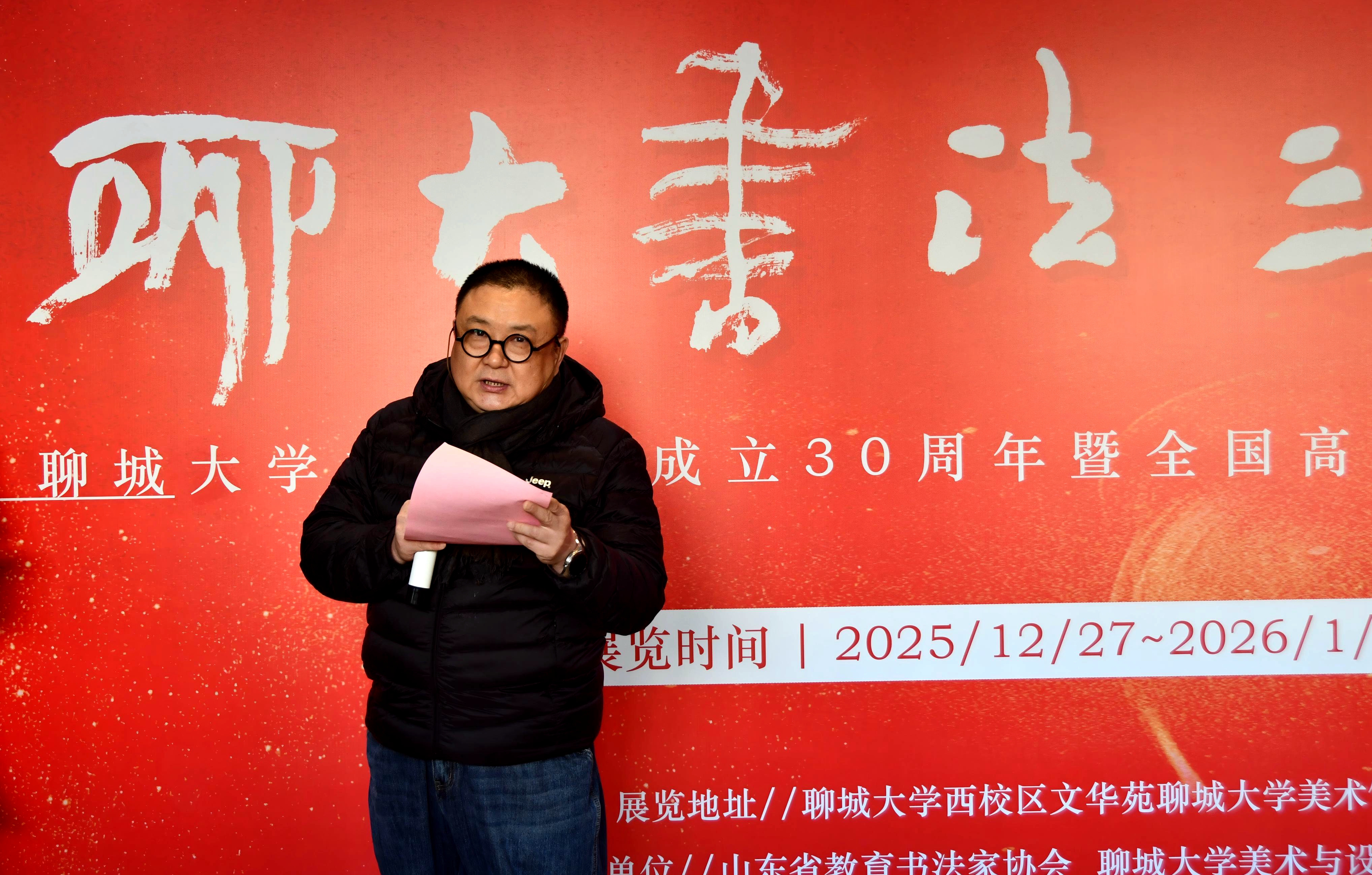关延平宣布聊城大学书法专业设立三十周年暨全国高校书法教师邀请展开幕。展览由山东省教育书法家协会与美术与设计学院联合主办,共征集展出深耕高校书法教育领域的优秀校友作品70余幅,生动诠释了聊大书法专业的育人成果,集中呈现了聊大书法人的专业造诣与精神传承。现场人头攒动,嘉宾与师生穿梭其间,驻足细品笔法韵味,交流艺术感悟,浓厚的艺术氛围扑面而来。