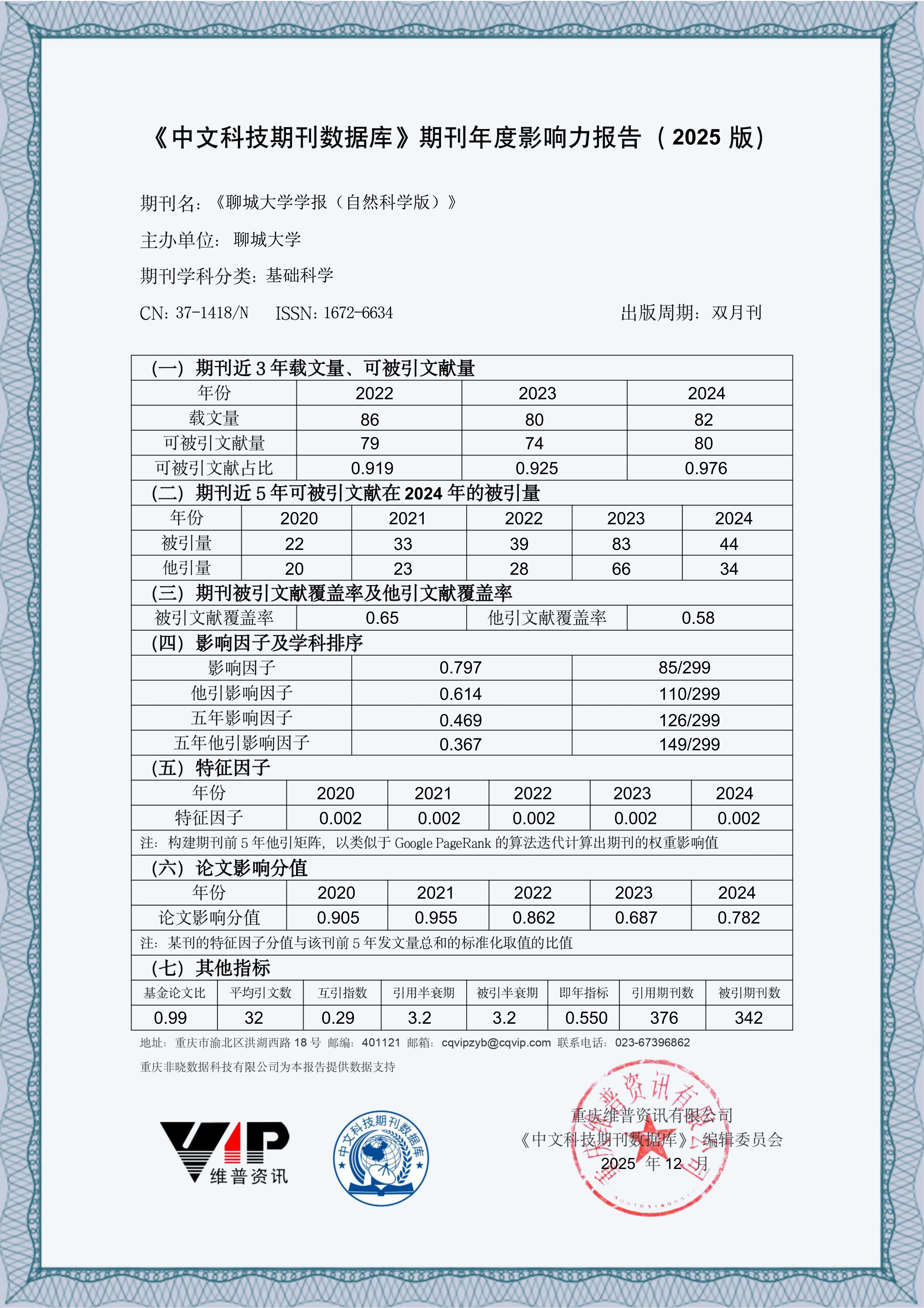 1月5日,维普网2025年度《期刊影响力报告》发布,《聊城大学学报(自然科学版)》在该数据库中的影响因子为0.797,在299种同类期刊学科排名第85位,在 2025 年度维普资讯期刊评选中荣获“学术影响力进步期刊”称号。