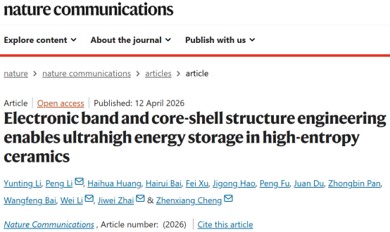 《电子能带与核壳结构工程实现高熵陶瓷中超高储能性能》 这篇论文,第一作者为我校研究生李云婷,该研究通过高熵设计驱动形成核壳异质结构,构筑阻止电击穿的屏障。研究者通过电子能带与核壳异质结构协同设计,最终在高熵陶瓷中获得了优异的储能性能其研究成果,为无铅储能陶瓷在高功率脉冲储能系统、航空航天飞行器高能效动力系统以及新能源汽车快充快放等领域的应用提供了科学支撑。