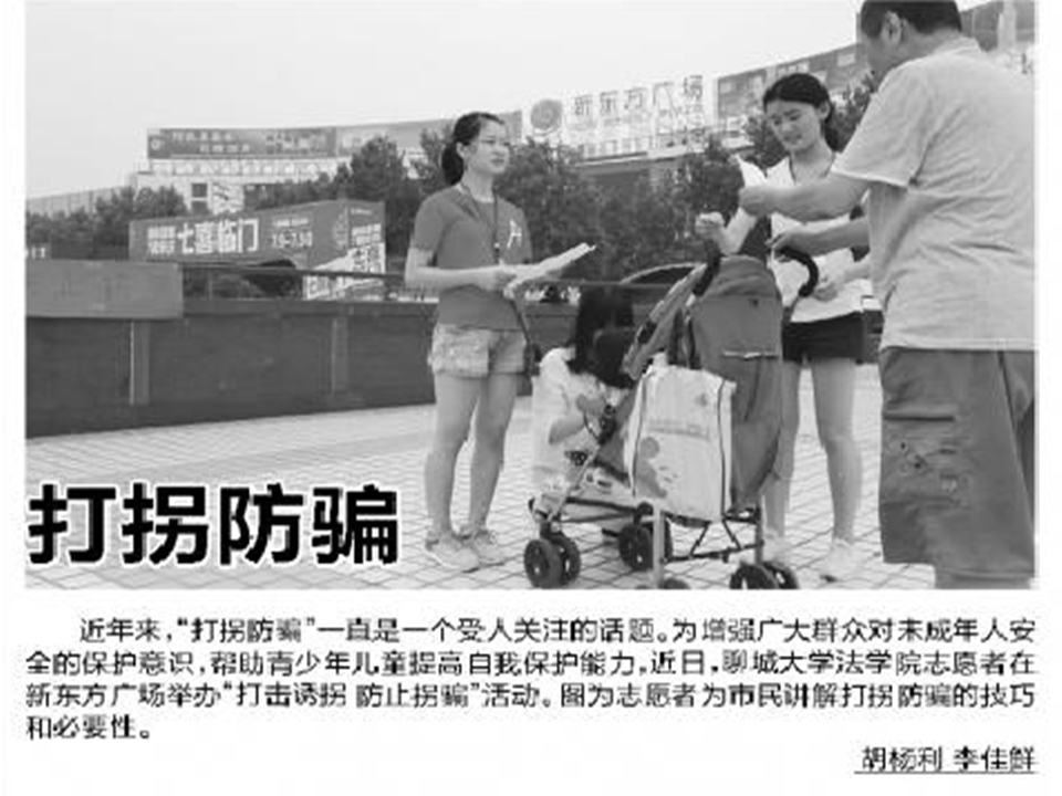 专题资讯 相关链接 教育部 山东省教育厅 中国大学生在线 校报 聊大新闻网 首页> 专题资讯> 媒体聊大> 【山东商报】报道法学院举办“打击诱拐 防止拐骗”活动 【山东商报】报道法学院举办“打击诱拐 防止拐骗”活动 作者:杨玉敏 来源:法学院 发布日期:2016-08-20 阅读次数: 字体: 【小】 【中】 【大】 近年来,“打拐防骗”一直是一个受人关注的话题。为增强广大群众对未成年人安全的保护意识,帮助青少年儿童提高自我保护能力,近日,聊城大学法学院志愿者在新东方广场举办“打击诱拐 防止拐骗”活动。 【山东商报】:http://media.dashangxx.com/reade/?id=893 0