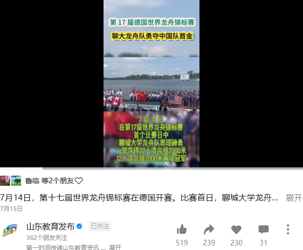 【山东教育发布】报道聊城大学龙舟队在17届德国世界龙舟锦标赛中勇夺中国队首金
