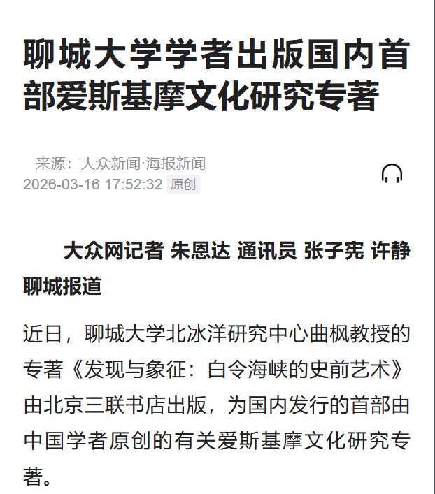 近日,山东聊城大学北冰洋研究中心曲枫教授的专著《发现与象征:白令海峡的史前艺术》由北京三联书店出版,为国内发行的首部由中国学者原创的有关爱斯基摩文化研究专著。