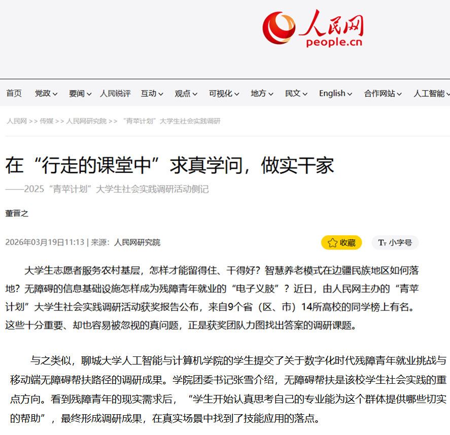 3月19日,【人民网】以《在“行走的课堂中”求真学问,做实干家——2025“青苹计划”大学生社会实践调研活动侧记》问题,报道了针对智慧养老模式开展的大学生社会实践调研成果,其中我校人工智能与计算机学院的学生提交的关于数字化时代残障青年就业挑战与移动端无障碍帮扶路径的调研成果得奖并接受采访。