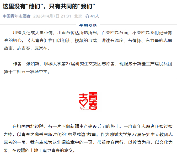 在祖国西北边陲,有一片叫做新疆生产建设兵团的热土。一群青年志愿者正接过接力棒,以青春之我书写新时代的“屯垦戍边”故事。作为聊城大学第27届研究生支教团志愿者的一员,我有幸成为这壮阔篇章中的一页,带着使命西行,以教育为舟,以文化为桨,在边疆的土地上追寻青春的意义。