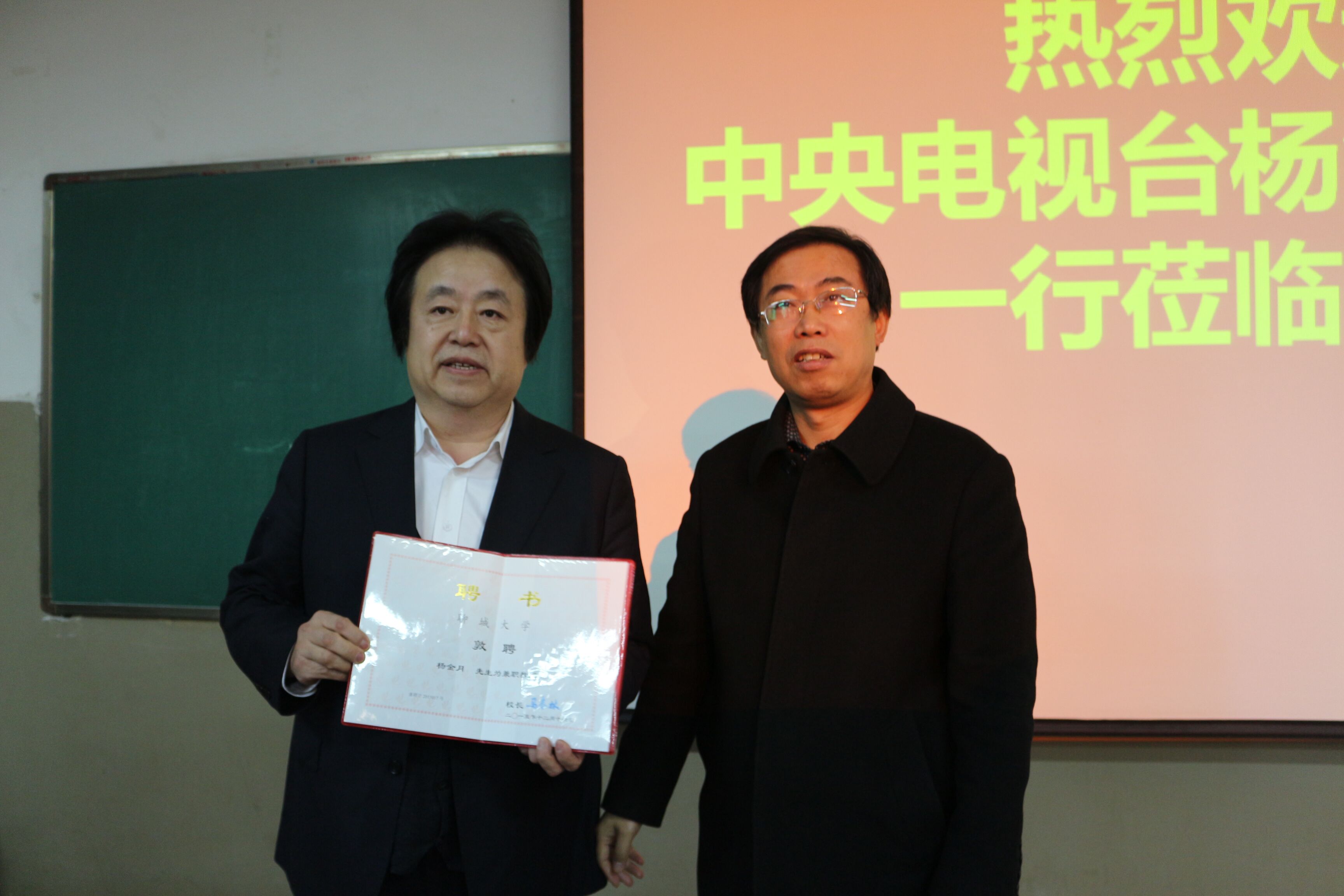 12月16日,中央电视台高级编辑杨金月博士做客文学院,受聘为我校兼职教授。校党委常委、副校长王昭风为其颁发了聘书。