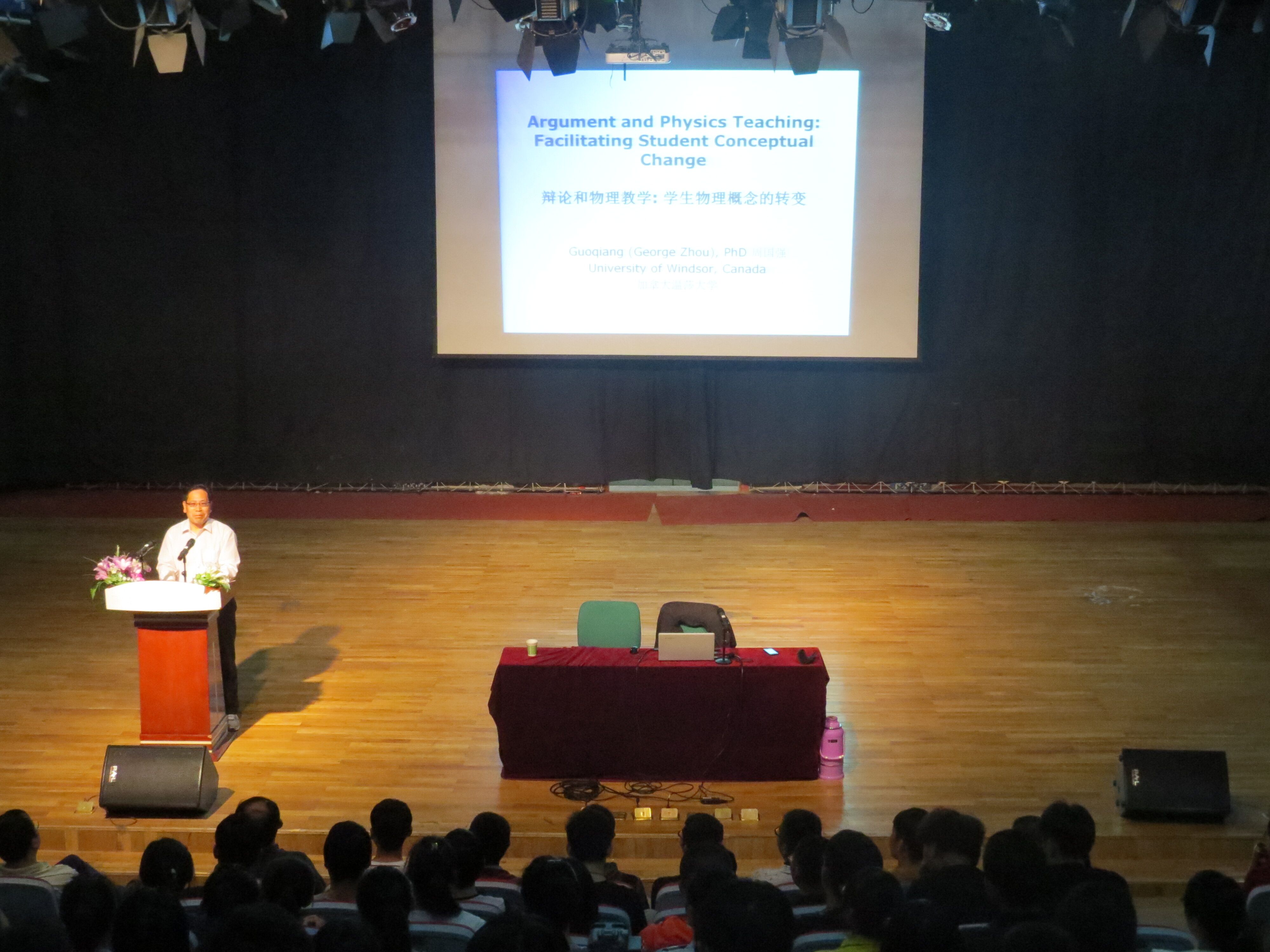活动伊始,周教授讲解了“美国下一代科学课程标准”、“学科核心概念”,提出了“辩论时科学实践的一个基本特征”、“科学是一个辩论的过程(science as argument)”理论。针对“前科学概念”,周国强认为,前概念常常与科学概念相背,前概念与历史上的概念相吻合和前概念不易改变,这正是教学的不易改变的原因。周教授还以“卡车与小轿车相撞为例,呼吁同学们应建构科学概念,捍卫科学概念。在最后的提问环节,师生们就自己的疑惑积极举手提问,现场互动十分热烈。