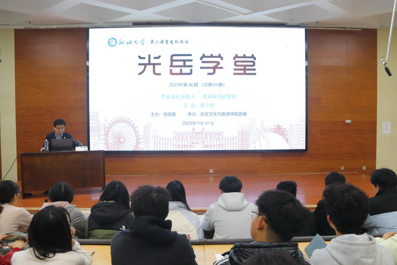 11月27日,由校团委主办、历史文化与旅游学院承办的第100期光岳学堂于6#A106举办。历史文化与旅游学院党委副书记、院长赵少峰应邀作题为《思政领航育新人 青春奋进赴新程》的讲座。